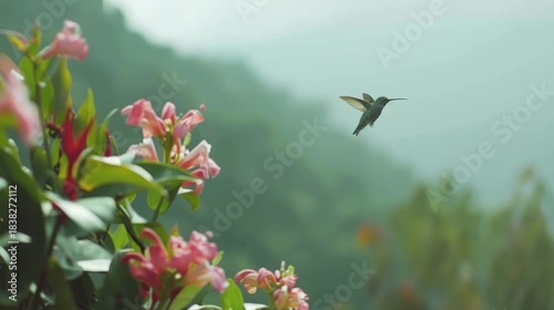 Naklejka premium Hummingbird Flying Near Pink Flowers in Natural Garden Scene