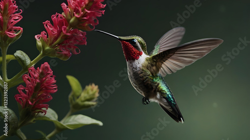 © Farizal, Fototapeta premium Hummingbird Flying Near Red Flowers with Green Background in Nature