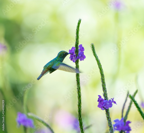 Fototapeta premium hummingbird flying next to purple flower