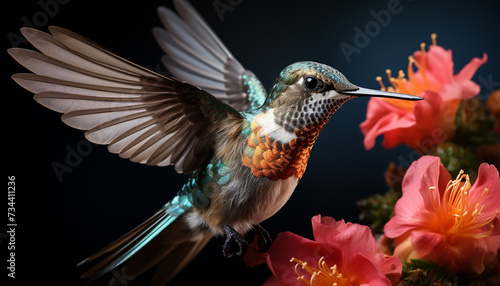 Fototapeta premium Hummingbird flying, vibrant feathers, pollinating flowers in nature beauty generated by AI