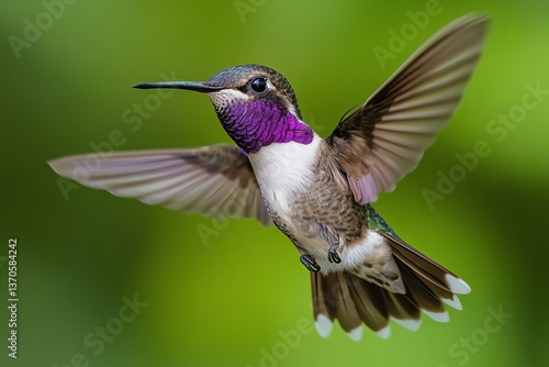 © eri, Fototapeta premium Hummingbird Flying with Wings Spread Against a Smooth Green Background