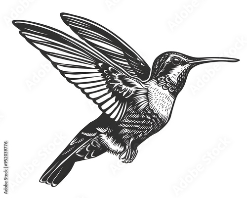 Fototapeta premium Hummingbird full aggressive expression black and white illustration