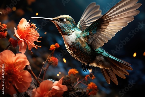 Fototapeta premium Hummingbird hanging over vibrant flowers in a colorful garden., generative IA