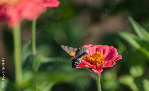 Obraz premium Hummingbird Hawk-moth hovering over flower.