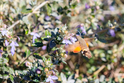Naklejka premium Hummingbird hawk-moth (Macroglossum stellatarum) feeding nectar from the tree germander or shrubby germander (Teucrium fruticans)