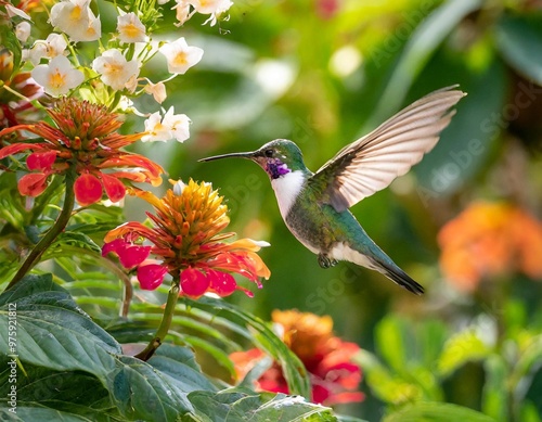 Fototapeta premium Hummingbird Hovering Beside Blooming Flowers in a Tropical Garden