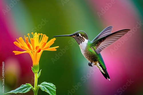Fototapeta premium Hummingbird Hovering by Vibrant Flower Representing Energy and Vitality