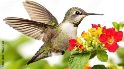 Naklejka premium Hummingbird Hovering by Vibrant Flowers in a Garden Setting