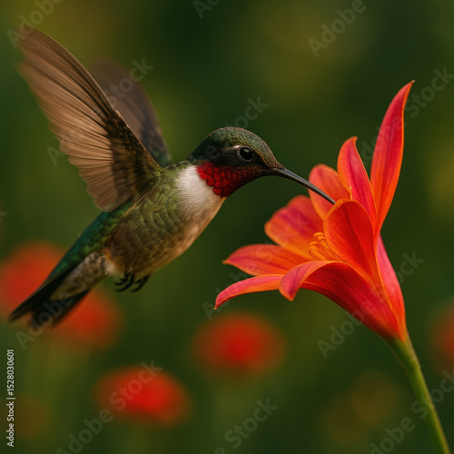 Naklejka premium Hummingbird hovering in front of red flower, wings spread wide, beak extended...