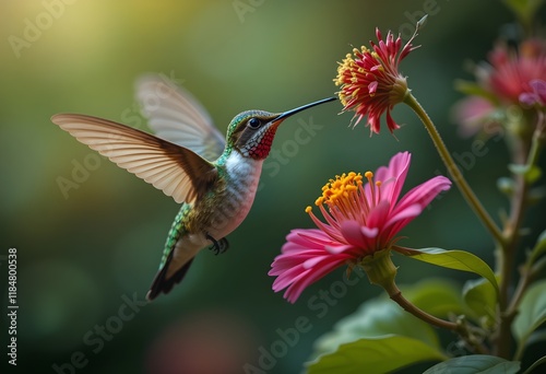 Fototapeta premium Hummingbird hovering in mid-air as it collects nectar from a vibrant flower