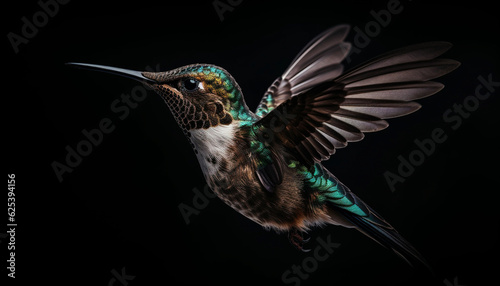 Fototapeta premium Hummingbird hovering mid air, iridescent feathers and spread wings, multi colored beauty generated by AI