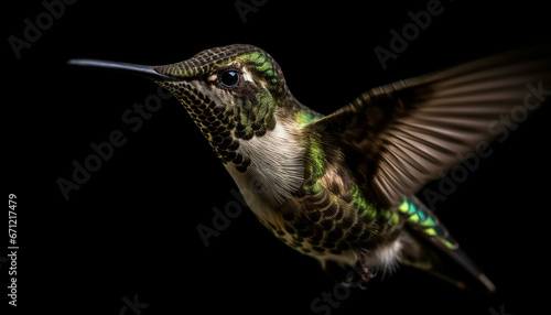 Fototapeta premium Hummingbird hovering mid air, spreading wings, flapping iridescent feathers in motion generated by AI
