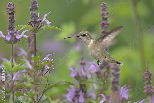 © Warakorn, Fototapeta premium Hummingbird hovering near a flower, feeding on nectar