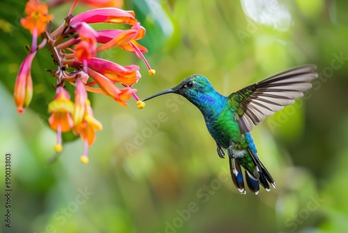 Fototapeta premium Hummingbird hovering near a flower vibrant colors