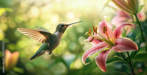 © malayeka, Fototapeta premium Hummingbird hovering near a pink lily in a sunlit garden.
