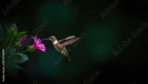 Fototapeta premium Hummingbird hovering near blossoms with lush green backdrop, illustrating...