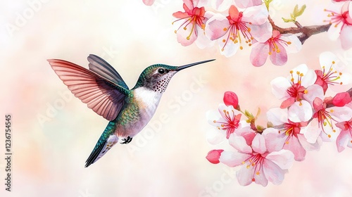 Fototapeta premium Hummingbird Hovering Near Bright Blossom in Soft Background