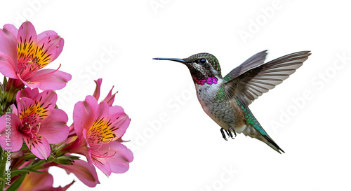 © Maman, Fototapeta premium Hummingbird Hovering Near Pink Alstroemeria Flowers