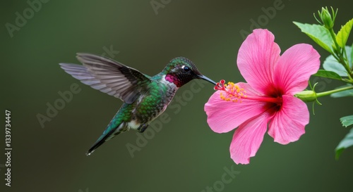 Fototapeta premium Hummingbird Hovering Near Pink Flower Extracting Nectar in Natural Habitat