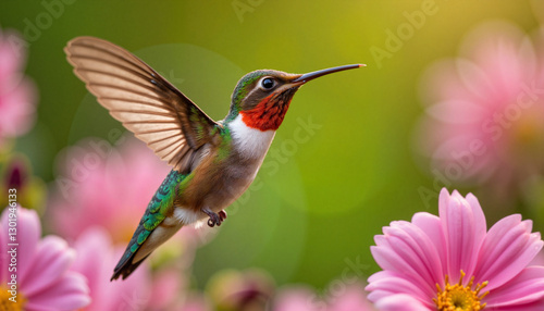 © Anastasiia, Naklejka premium Hummingbird hovering near pink flowers