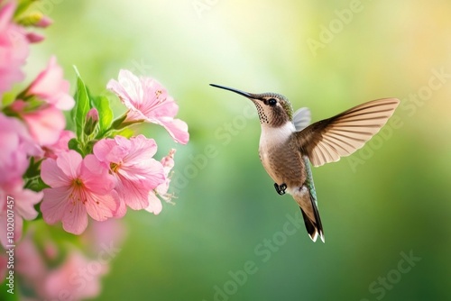 © malayeka, Fototapeta premium Hummingbird hovering near pink flowers. (1)