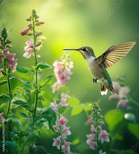 Fototapeta premium Hummingbird hovering near pink flowers.