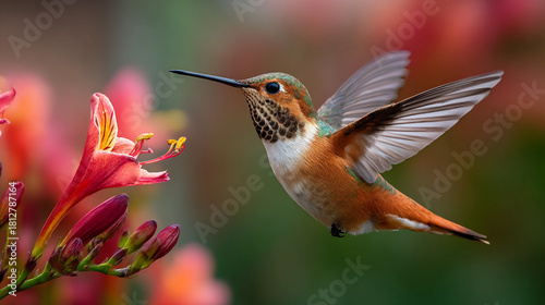 Fototapeta premium Hummingbird hovering near pink flowers in a colorful garden