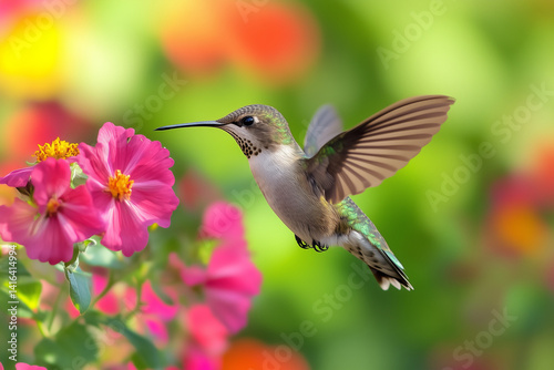 © Ayu, Fototapeta premium Hummingbird Hovering Near Pink Flowers In Garden