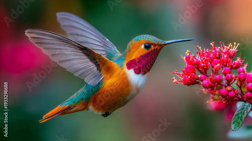 © Khaligo, Fototapeta premium Hummingbird hovering near red flower collecting nectar