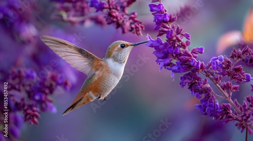 Obraz premium Hummingbird Hovering Near Vibrant Purple Flowers in Nature Scene