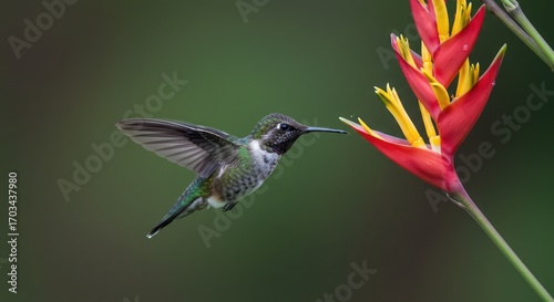© Karam, Naklejka premium Hummingbird hovering near vibrant red and yellow flower during flight, capturing nature's beauty and intricate details