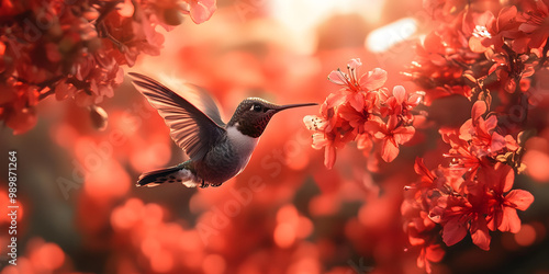 Obraz premium Hummingbird hovering near vibrant red flowers