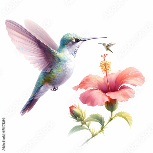 © XIAOBING, Obraz premium hummingbird hovering over a flower on white background