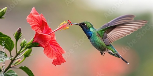 Fototapeta premium Hummingbird hovering over a vibrant flower in a lush garden nature...