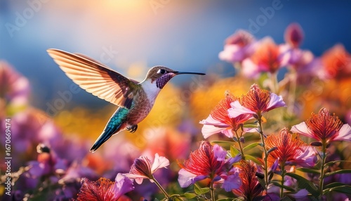 Naklejka premium hummingbird hovering over blooming wildflowers creates serene