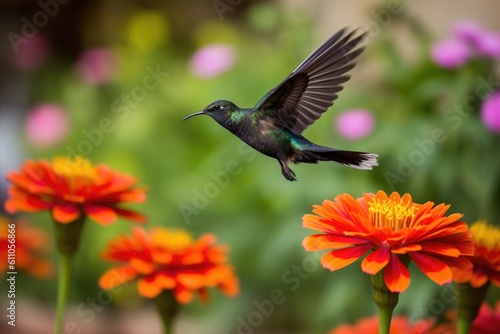 Fototapeta premium hummingbird hovering over vibrant flower garden, created with generative ai