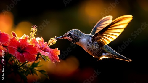 © Vitalii But, Naklejka premium hummingbird hovers gracefully as it drinks nectar from bright red hibiscus flower amid lush tropical garden illuminated warm sunlight.