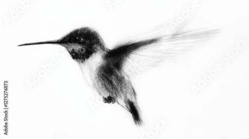 Fototapeta premium Hummingbird in flight, a detailed pencil drawing with soft shading on a white background.