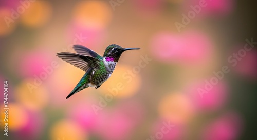 © Mr Isharyanto, Fototapeta premium Hummingbird in flight against blurred floral background nature photography