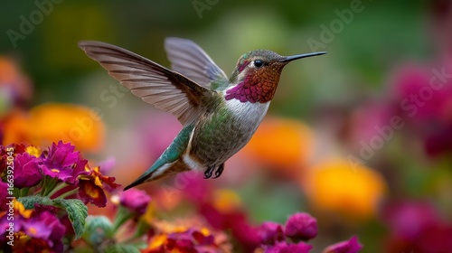 © nivi, Naklejka premium Hummingbird in flight among flowers