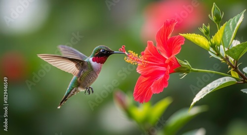 © Bounpaseuth, Obraz premium Hummingbird in Flight: Capture a stunning moment as a vibrant hummingbird delicately hovers near a radiant red flower, its beak gently immersed in search of sweet nectar.