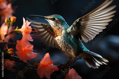 Fototapeta premium Hummingbird in flight captures the delicacy of a flower., generative IA