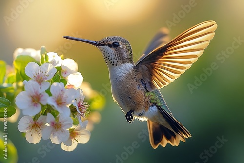 © Liza, Fototapeta premium Hummingbird in flight collecting nectar from a white flower