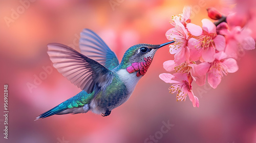 Fototapeta premium Hummingbird in Flight, Drinking Nectar from a Pink Flower - Realistic...