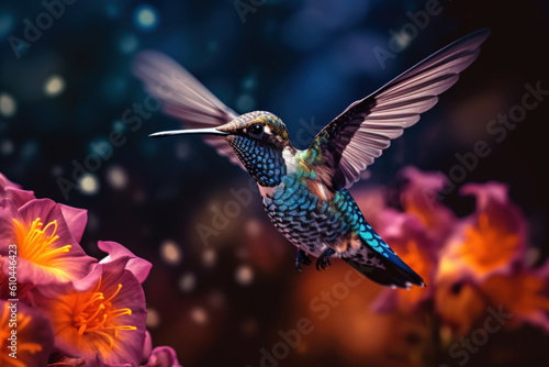 Obraz premium Hummingbird in flight, drinks from a flower. Generative AI