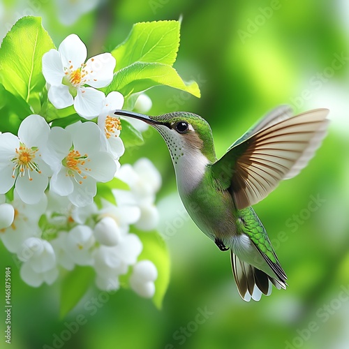 © Duit, Fototapeta premium Hummingbird in flight, feasting on spring blossoms