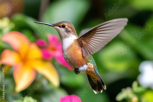 © Arx PhotoStock, Fototapeta premium Hummingbird in flight, feeding among colorful flowers, blurred background