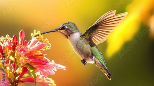 © Ilmi, Fototapeta premium Hummingbird in flight, feeding from a flower