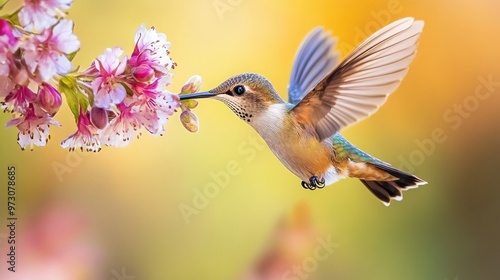 © Ilmi, Fototapeta premium Hummingbird in flight, feeding from a flower