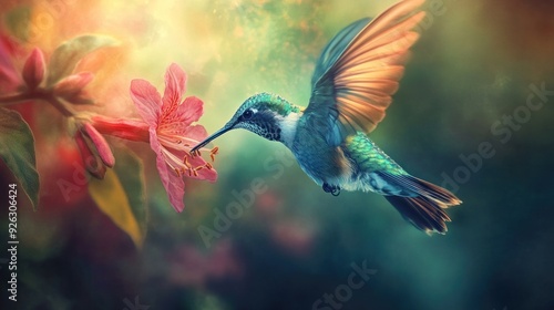 © Rere_Art151, Fototapeta premium Hummingbird in Flight, Feeding from a Pink Flower